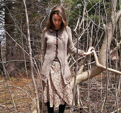 A pretty coat, warm and fast to knit, with an instarsia dear on the back and stranded colorwork and latvian braids on the cuffs and bottom edge.