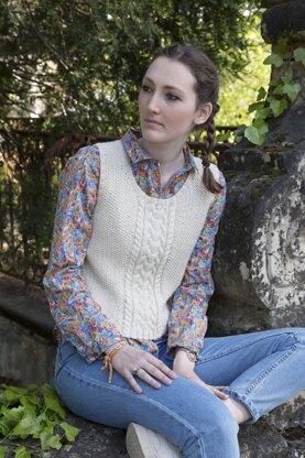 A neat slipovr perfect for layering over a shirt or printed cddress. The staghorn cable pattern on the front and back is bordered with a right and left twist cable on either side. Knitted in Rowan Pure Wool Worsted.
