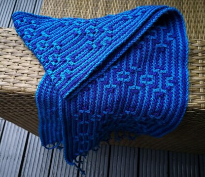Mosaic crochet style scarf with plaited ends - Mosaic Crochet looks really difficult but it is actually so easy to do and the results are incredible This pattern has easy to follow instructions and is suitable for any crocheter who is able to do the UK double crochet (US single crochet) and UK treble crochet (US double crochet) stitches as well as how to chain You can adjust the size and could even make it into a blanket if you keep repeating the pattern or I am writing more mosaic scarf patterns which when put together will make a blanket of different patterns - this is a work in progress It takes just 2 balls of 100g DK yarn and a 4.5mm crochet hook (if you are a very loose hooker go down to a 4mm hook) per scarf The effects are even more amazing when you use two contrasting colours and/or bright variegated yarn with black There are now lots of tutorials on U Tube on Mosaic Crochet if you need any more help This pattern takes you row by row through the full scarf