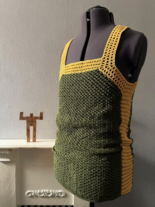 This crochet pattern is for a Tank Top made from two types of mesh. The shoulder, chest, and Side Bands are all a square mesh. The main fill of the front and back are a chain mesh. And being crocheted mesh, there is a LOT of stretch in the finished item.
