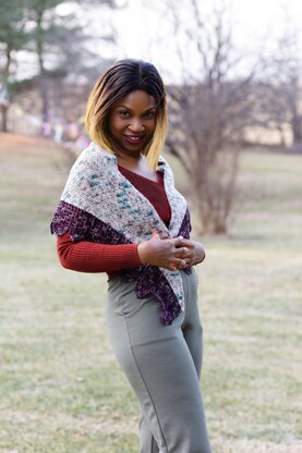 Changing Seasons is a beautiful two-color shawl worked from side to side. With a simple main field and a filet crochet style edging, this shawl is perfect for any time of day – morning, noon, or evening. Use a speckle and a solid as seen in the sample, or change it up using gradients, single colors, or even stripes. Make it the way you like it! In working the shawl, you will learn how to change the color mid-row, every row, without having to cut and weave in ends. You will even learn the trick to hide the strand of yarn that moves up the middle of the fabric.