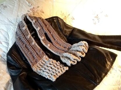 Textured with raised stitches throughout. Pretty ruffled design. Unique insert style for securing scarf. Simple crochet stitches used.