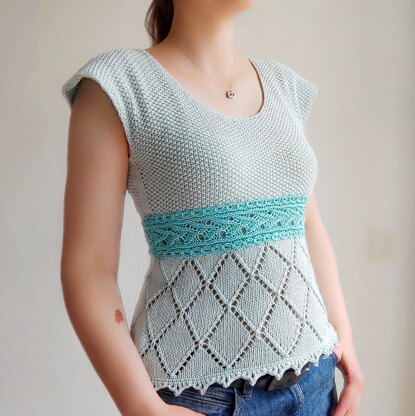 Charlotte is 4-in-1 cropped top, long top, tunic and dress pattern. Charlotte is a sleeveless summer garment with a square neckline, featuring high waistline with a lace belt, moss stitch upper body, diamond lace pattern for lower body and crochet edge hem. You can choose out of 4 length options: cropped top, long top, tunic or dress.