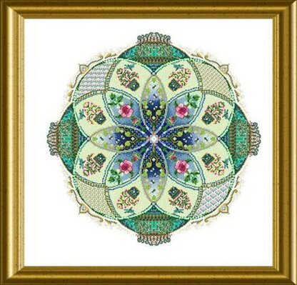 Pattern/Chart only. Suggested materials (not included): Model stitched over 2 threads on 32 Ct. white, black or light morning rose Belfast linen with DMC floss, Caron Waterlilies, Dinky Dyes silk, Gloriana silk, Rainbow Gallery Splendor, Rainbow Gallery Petite Treasure Braid, Rainbow Gallery Petite Silk Lame, Delica Beads, and Swarovski Crystals. Stitch Count: 255 x 255.