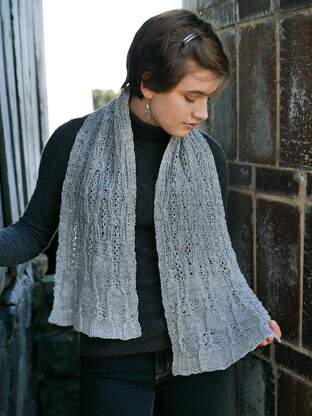 Motifs lifted from the Art Deco period are combined to create a luxurious surface in this scarf/stole design in three sizes (petite/tall scarf and stole), meant to be worked in a shimmery yarn blend. While the visual effect is complex, the patterns are simple to work, relying on cable tension for movement. Light and dark areas are the result of shifting fabric density. This design is worked in one piece from beginning to end and is easily resized.