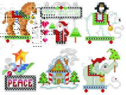 By Kooler Design Studio. Fourth set of checkered ornaments featuring checkered borders or motifs. Pull-toys are the ornaments that are included in this set. collect all four sets for a wonderful gift for a loved one or decorate your tree with checkered ornaments.