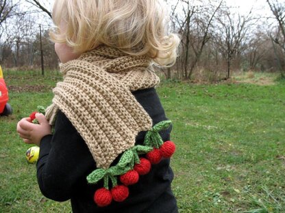 This sweet girls' scarf (although boys can rock it, too, ahem) is adorable to look at and fun to work. Scarf is worked flat on size 7 straight needles. Cherries are worked in the round on size 6 DPNs, with stems and leaves worked flat.