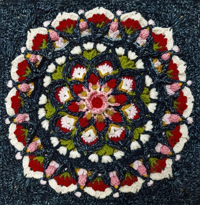 The size after blocking is 15,7”X15,7”/40x40 cm. The model is made with Stylecraft Special and Batik yarn. It can be made in Scheepajes Colorcrafter since both threads have the same elasticity and gauge. Other yarns with similar characteristics are Studio Essential by Deramores, Astra by Patons, Elle Family Knit DK and Emu Clasic DK. If you want to work with cotton, Muskad and Safron of the brands Drops is a good option, however, the elasticity is slightly lower, so –depending on your tension– sometimes you will have to add one or two chains