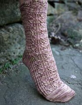 A top-down sock in four sizes (S/M/L/XL) with a pretty piecrust edge around the top and a pattern of cherries strung down the leg and over the foot to celebrate a most American summer dessert favorite. Substituting needles and/or yarn may result in an overall variation in size.
