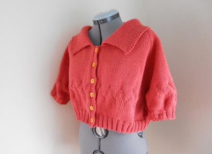 This cropped raglan cardigan is a great piece for spring and fall, when it’s a little too cool for a tank top but not cold enough for a full sweater. The cotton-blend yarn is soft and lightweight and makes for a comfortable oversized cardigan that looks good worn open or closed. The sleeves are meant to be elbow-length and the body is meant to end at the waist; I designed the sweater to be worked from the top-down so it would be easy to adjust the measurements as needed. I added a wide fold-over collar and a chevron design across the body and sleeves to add interest to an otherwise simple shape.