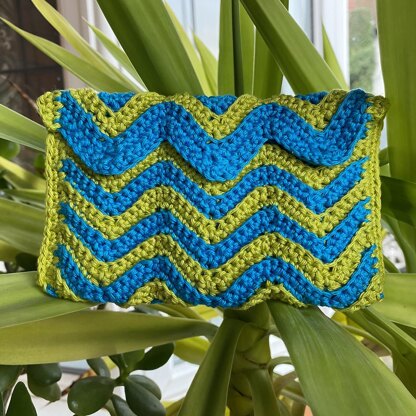 This purse is worked as one rectangle and is then joined at the side edges. It has a zip closure with optional poppers and instructions are included for adding a lining.