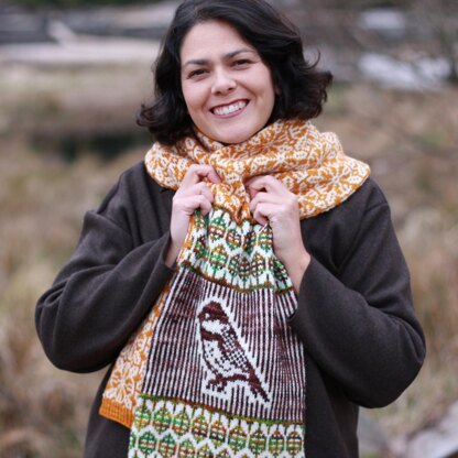 While I may not be the best birder, I know and love a chickadee when I hear one. This scarf is a tube, knit in the round, beginning and ending with a ribbed border.