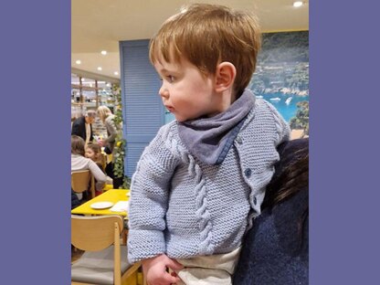 Materials: James C Brett Baby Twinkle DK: 2(2–3–3) x 100 g balls [300m/328 yds] OR James C Brett Crafter DK: 3(4 – 4 – 5) x 50g balls [150m/168 yds]; pair each 3 mm and 3¾ mm needles; 3.5 mm crochet hook; cable needle; stitch holder; 5(6–6–7) buttons.