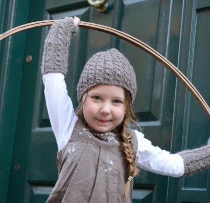 Happy hat and cuffs are ideal for a quick project for a little one in your life. Cute and functional at the same time they make a great gift for a little girl or a little boy. The hat is snug fitting and very warm and the cuffs adds crucial insulation around the wrists. The pattern gives instructions to make both the beanie style hat and the cute cuffs. The clever shaping is hidden in the cables and makes the hat an interesting project to make, whilst the cuffs are an easy introduction to cabling. This set goes perfectly with Havana Cape as shown in the third photo.