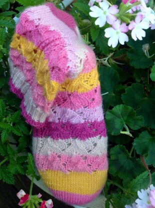 The "Chinese Lace" pattern reminds me of wisteria blooms. The pattern would be beautiful in solid or tonal yarns. I went wild with stripes. :) Sock has a short row heel. Options include tapered or rounded toe, generic or calculated foot length, and Russian or picot bind off.