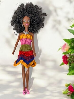 A modern and fashionable dress to knit for a teenage fashion doll such as Barbie and Sindy.