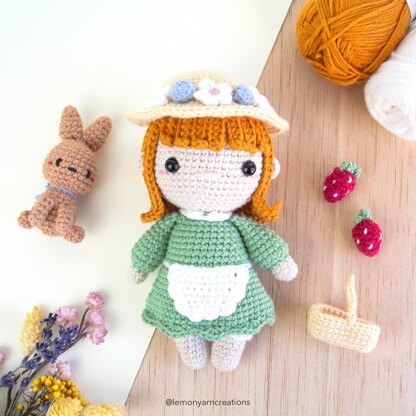 - You'll need: cotton yarn in 9 colors; 1 pair of 8mm safety eyes for the doll; black embroidery thread for the bunny;