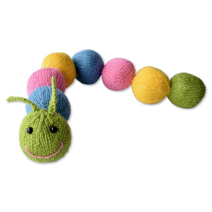 Knit up a cute and colourful caterpillar. This toy is made by knitting spheres and sewing them together in a row, so you can easily make a longer caterpillar by adding more spheres. Designed by Amanda Berry @fluffandfuzz, the caterpillar is knitted in acrylic DK yarns on single pointed needles (not in the round). For beginners and above, other techniques used include seaming, kfb increase and k2tog decrease.