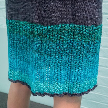 This skirt recipe was designed to make use of Neighborhood Fiber Company’s lovely Studio DK gradient and a coordinating color, to be a companion to the Business in the Front cardigan. The hem lace shows off your legs without giving too much away, and the skirt is completely customized to your measurements.
