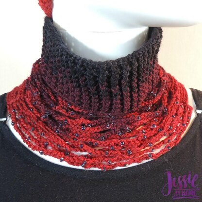 The Chrissy Neck Warmer is inspired by one of my knit and crochet combined patterns: the Ellen Turtle-neck-lace. I’ve had the Fiber Optics yarn for a few years and just couldn’t decide what to make with it. Then when I got these awesome beads from Bead Biz, I suddenly knew what to do! I’m quite happy with the finished result, and I’m sure you will be too!