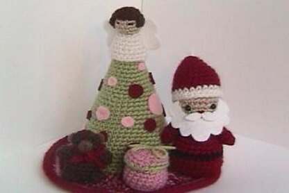 This crochet pattern set will give to instructions to make the following: Christmas Tree Table Decoration ( Rug, tree, Santa ornament, present, little bear, and angel tree topper) Penguin ornament Christmas bells Swiss Roll Ornament Snowman Ornament Christmas stocking with mouse Christmas Light Bulbs Hot chocolate mug on plate with cookies ornament