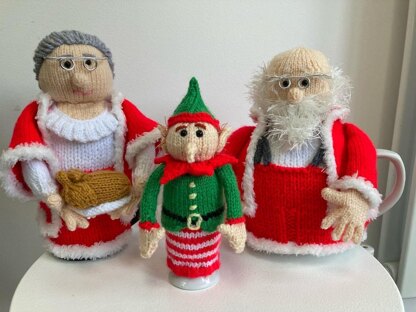Father Christmas made to fit standard teapot (six cup) with Mrs Claus mad eto fit a small cafetiere and a Christmas Elf made to fit a stadard eggcup.