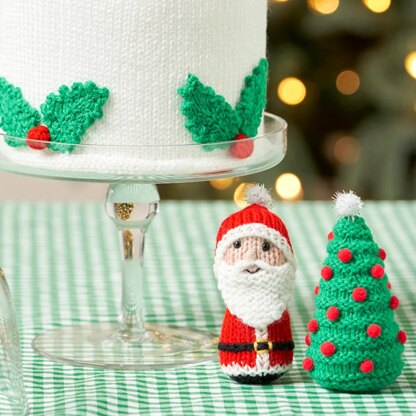 Knit up this Christmas Cake topped with a display of Santa’s living room, and use some glittery yarns too for a festive sparkly touch. Each of the top decorations are stuffed toys, so you can use these to make a diorama display without the cake base, hang them on your tree, or use them to top an edible cake. My cake covers a polystyrene cake dummy so it has a smooth and flat surface to decorate. If you cannot find a cake dummy you could cut cardboard or plastic mesh pieces the same size as the cake, place these inside the walls of the cake, and stuff with filling instead. Designed by Amanda Berry @fluffandfuzz, this cake is knitted in acrylic DK yarns. The cake cover is knit in the round using DPNs or a circular needle for Magic Loop. The decorations are worked flat on single pointed needles (not in the round). The icing and fire surround are i-cord tubes which can be worked on two DPNs or a circular needle. For confident beginners/intermediate and above.