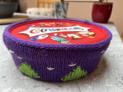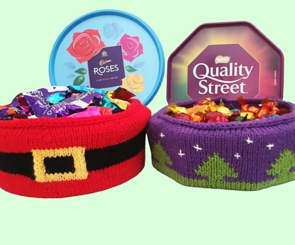 Here is a knitting pattern for festive container covers designed to fit 600g-700g chocolate tubs.