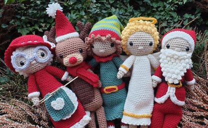 Complete set of 5 crochet amigurumi PATTERNS! Patterns include the list of suggested used yarns (Paintbox and Stylecraft Yarns) Included patterns: - Elf - about 40 cm - Angel - about 40 cm - Grandma Santa - about 40 cm - Rudolph - about 47 cm - Santa Claus - about 40 cm !! Sizes using Aran weight yarn and 5.00 mm crochet hook !! The patterns are written in English (US) using US terminology.