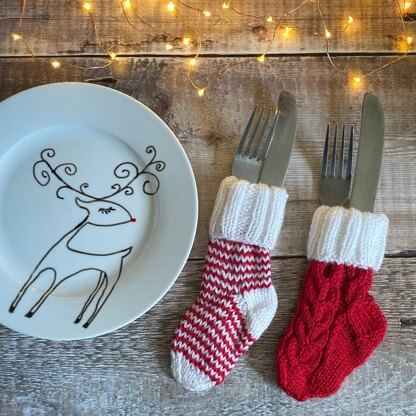 Originally designed as a table decoration for your Christmas cutlery, these socks can be used for all sorts of Christmas decor. String them up as a garland, knit 24 and use as an advent calendar, or hang them on the tree with candy cane popping out. They are only limited by your imagination.