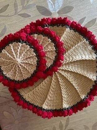 A festive Christmas set of handmade table mat and matching mug coasters, each featuring a vivid red floral border and a textured spiral center in warm beige. Crafted from a soft 50/50 cotton-acrylic blend, they bring elegance to your holiday table while protecting surfaces, and also make a thoughtful Christmas gift.