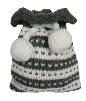 The knitting pattern is written and charted. Very quick to knit and because you need so little yarn it’s a great stash busting project. The finished sack measures approx 8” in height and 5” in width.
