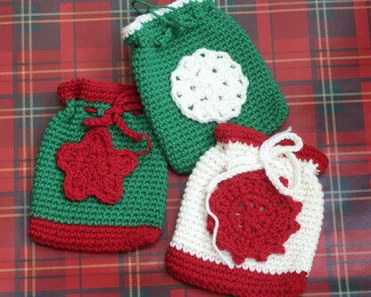 The bags in the picture are approximately 6 inches long and 5 1/2 inches wide by can be make in any size. Any worsted weight yarn can be used. You don't need a lot of yarn so they are a good way to use up your stash.