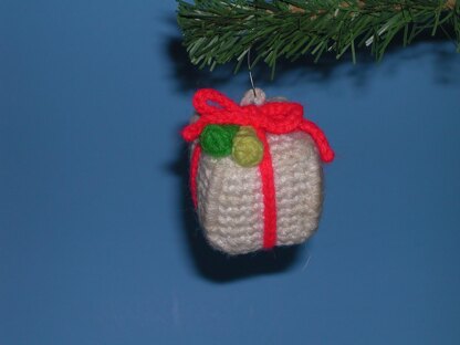 This adorable little Christmas package ornament, with its bright bow and bell decorations, will look great on your Christmas tree. It is made with scraps of worsted weight yarn and a small amount of dacron stuffing. I designed a whole series of these, because I adopted a cat who loved to climb the Christmas tree. Obviously, they are pet- and kid-proof and washable, too.