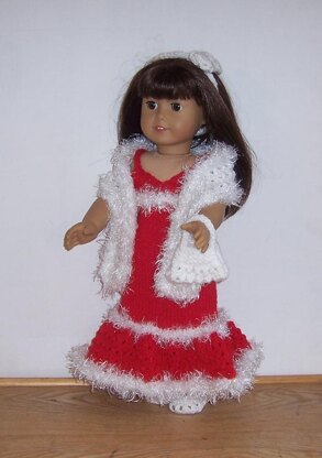 This knitting pattern is for a dress with a flared bottom skirt, trimmed with plain ostrich yarn, no fastenings are needed as the dress just pulls up. There is a stole/shoulder wrap for those chilly evenings, and matching purse, slippers and headband. The pattern is my own design,
