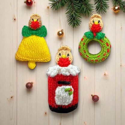 This knitting pattern is for a set of Christmas tree decorations. The decorations are of a pillar box, a wreath and a bell with a robin on top.