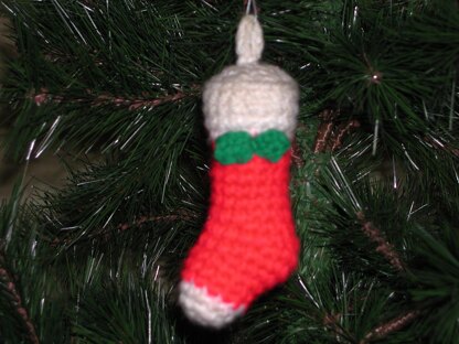 This adorable little stocking ornament will look great on your Christmas tree. It is made with scraps of worsted weight yarn and a small amount of Dacron stuffing. I designed a whole series of these, because I adopted a cat who loved to climb the Christmas tree. Obviously, they are pet- and kid-proof and washable, too.