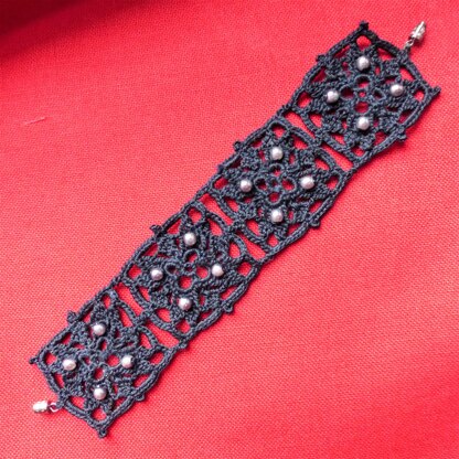 A beautiful bracelet to offer for Christmas or any other special occasion, or a nice gift to give to oneself. It uses the classic "sun square", worked with a fine thread to give a real stained glass effect. It is enhanced with pearls to give it an even more precious look. It can be made in the traditional Christmas colors, black or burgundy, or worked in a lighter color for a more natural effect. Even if it is quite spectacular, it is not very difficult to make. It is especially necessary to work with a regular stitch. The explanations contained in the PDF include 1 main diagram and 7 detail diagrams as well as a step-by-step guide of 53 photos to help make it.