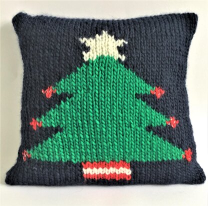 Christmas in a soft and cuddly cushion cover. Optional sparkly thread highlights the star, balls on the tree and ribbon round the pot.