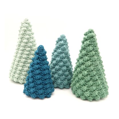 MEASUREMENTS With the yarns used in this project, the L tree measures 15 cm tall and 8 cm wide, the M tree measures 13 cm tall and 7 cm wide, the S tree measures 11 cm tall and 6 cm wide and the XS tree measures 9 cm tall and 5 cm wide.