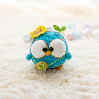 Materials Needed: Yarn A (1 ball) --- Edelweiss yarn #2, deep lake blue #15 Yarn B (10 grams) --- Edelweiss yarn #2, white #01 Yarn C (5 grams) --- Edelweiss yarn #2, orange #32 Yarn D (5 grams) --- 4-ply milk cotton, mustard green #25 Yarn E (5 grams) --- 4-ply milk cotton, yellowish brown #30 Yarn F(2 grams) --- bright yellow 4-ply milk cotton, bright yellow #12 Toy stuffing (50 grams) Scissors Yarn needle Stitch marker Alcohol glue 2.0 mm crochet hook Two 12mm eyes with green edges