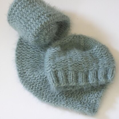 American knitting terms. Two patterns for a matching hat and scarf. These are knit in a soft chunky fluffy yarn held double so they work up quickly. Easy but interesting patterns, they product a soft thick warm hat and scarf. You can make the scarf any size; three sizes are included for the hat, woman's small, medium and large. The hat is knit in the round so it is a good pattern to practice this technique. The pattern calls for readily available Yarn Bee Ethereal Eyelash yarn but another chunky yarn can be substituted.