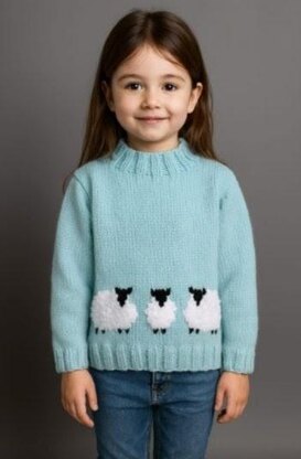 Knitting pattern for a Chunky sweater for children aged 4 to 11 years featuring cute fluffy Sheep on the back and front. Knitted in Chunky (12 ply) Yarn so grows very quickly. Large, coloured intarsia chart to follow for the Sheep and the pattern is colour coded for the different sizes.