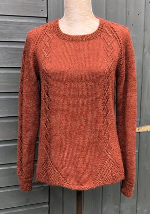A very pretty raglan design using a background of stocking stitch, and flattering triangular panels at lower edge of back and front. Once these triangular panels are completed, small eyelet diamonds emerge and carry on up to the shoulder. These diamond eyelets are repeated up the sleeves. The cuffs and the narrow neckband are worked in single rib. Worked bottom up and with full written instructions.