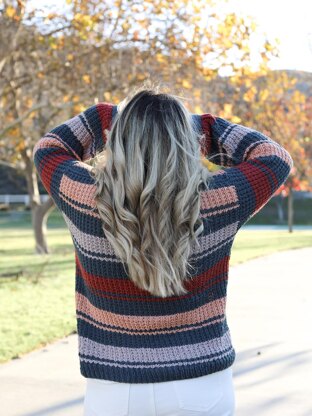 Description: A blend of cool and warm tones add to the Fall love vibe of this comfy sweater. Made in a 2 row repeat of soothing Broken Rib texture with a folded collar and cuff detailing, that are a joy to work up! This is available as a kit via Lion Brand Yarn in the super soft yarn line I used. I went for a cozy Fall vibe to compliment this fitted yet slightly oversized cozy fit. Worked in the round and flat, with seams only at the shoulders. Easily pair this with comfy joggers to look cozy yet put together or with jeans and boots for a night look!