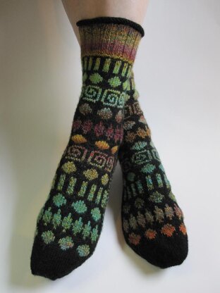Love self-striping yarn, but getting tired of all striped socks? This fun pair uses one skein of self-striping yarn and one solid for a fair-isle knitting experience that has a lot of color punch without a million color changes.