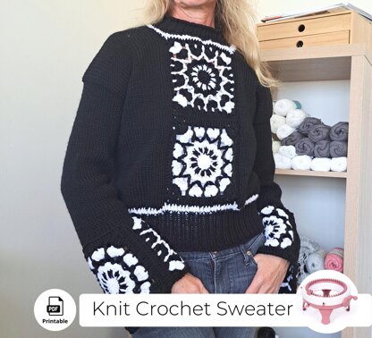 Sentro knitted sweater Pattern for XS - XL. This sweater can be made in any circular knitting machine with 46 or more needles! Knitting basic stitches are all explained in the video, plus a full tutorial on how to make this beautiful granny square! It can be made with any acrylic yarn your machine likes! Material needed: - Crochet hook size 4.5 mm - knitting needles 5.5 mm or addi or sentro 48 knitting machine