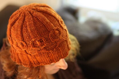 This beanie features a variation on the banjo cable with a two-row nupp in the center to mimic the common circle-with-dot motif.