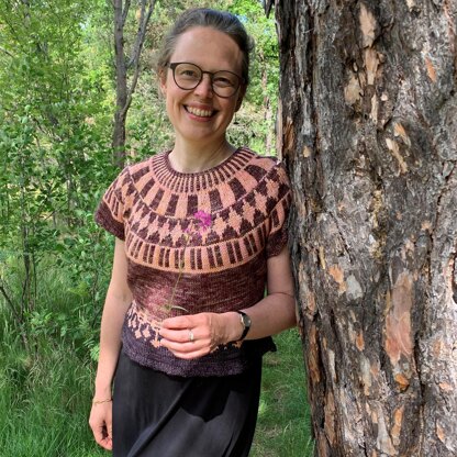 This slightly cropped tee is worked top-down with short-rows for neck shaping. Then there's a stranded two-color yoke, separation of sleeves and a body where you can select to decrease for your waist or not. In my sample I have made waist decreases, but there are instructions for both variants. At the waist there is more stranded colorwork for embellishment and the body has a flared finish and a picot bindoff. Sleeves are also finished by picot.