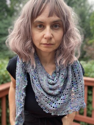 The City Lights Shawl is a triangular shaped shawl with a slight rise along the nape of the neck. Made using two skeins of fingering weight yarn, with beads and a fringe trim border, give it that extra sparkle that easily transitions from day to night.